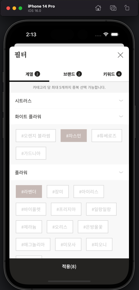 센츠노트 프로젝트에는 필터링을 하여 향수를 검색하는 뷰가 있다. 이때 계열, 브랜드, 키워드 3가지 카테고리에서 각각 최대 5개의 키워드를 선택해서 검색을 할 수 있다.